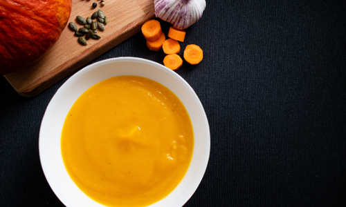 1. かぼちゃ50g・にんじん30g・鶏むね肉30gを水200mLで柔らかく煮る