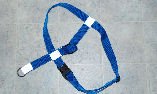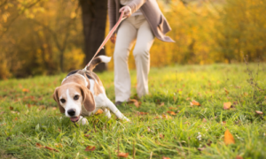 1. 歩行中に「ストップ」と声をかけ、同時にリードを胸に当てブレーキ